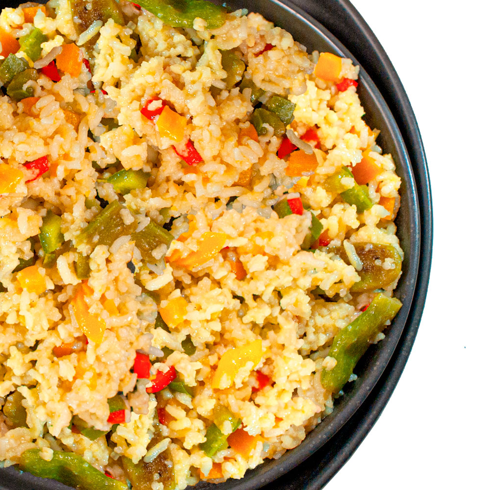 Ingredientes: arroz, ajo, zanahoria, pimiento rojo, pimiento verde, caldo de derduras, especias.